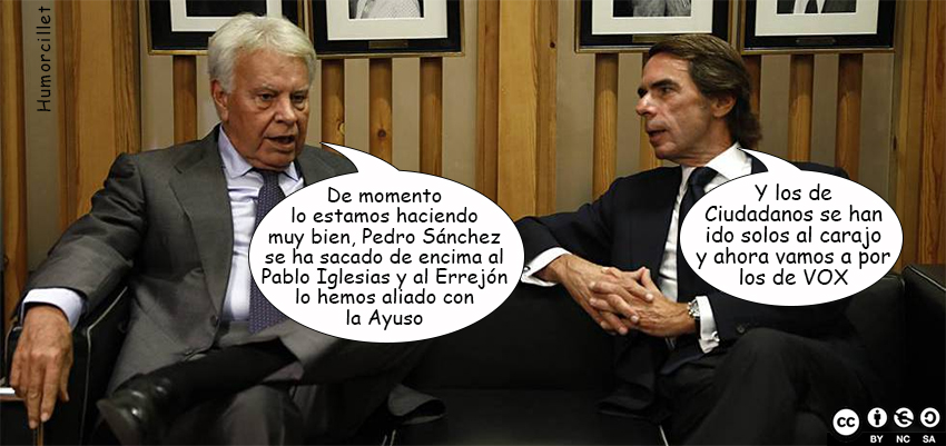 Dos ex-presidentes de España que han conseguido que la luz se dispare para sus ex-votantes. El PPSOE siempre velando por sus bolsillos y no por los de los ciudadanos, no importa cuando leas ésto. Cuidado, ahora te están vendiendo la moto para tomar conciencia del consumo del agua, seguro que será el próximo chollo de las puertas giratorias y pagaremos más cara el agua que la cerveza.